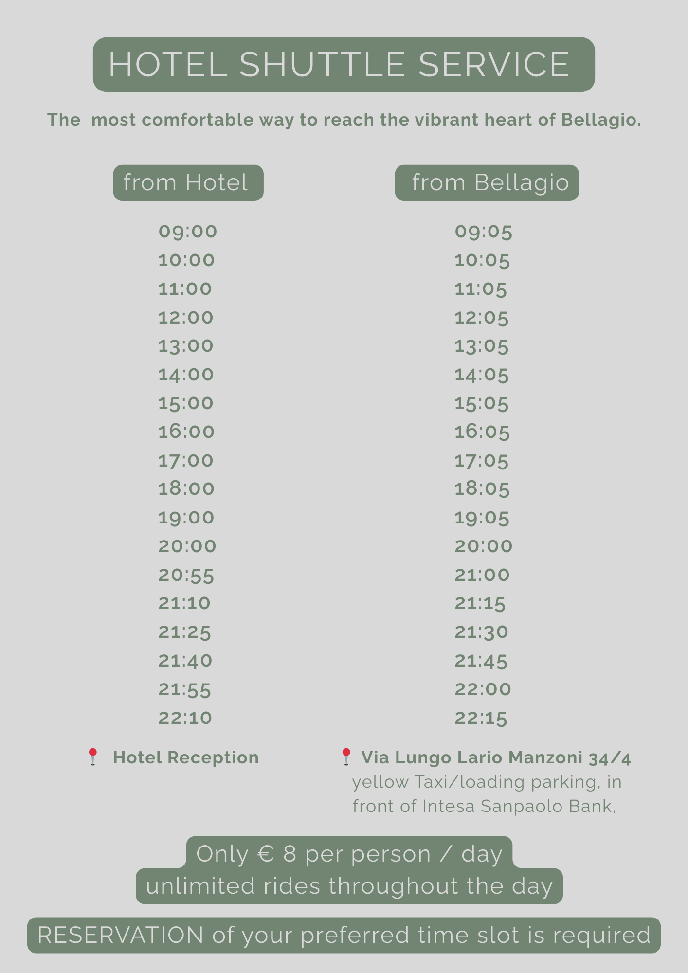 Alternatively, you can rely on our shuttle service, operating for the return journey until 10pm.